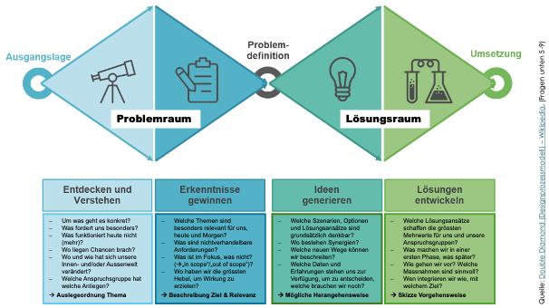 Wenn wir etwas gelernt haben in den letzten 20 Jahren, dann ist es die Fähigkeit, sofort ins Tun zu kommen und unsere persönliche Effizienz auf Vorderfrau zu trimmen. Und genau das fliegt uns jetzt so richtig um die Ohren. Das französische Bonmot bringt wunderbar auf den Punkt, was ich mir auch für Organisationen wünsche: «reculer pour mieux sauter». In vielen Projekten wird euphorisch gestartet und die tiefhängenden Früchte werden fleissig eingesammelt, doch im Verlauf der Zeit rächt es sich, wenn man Anspruchsgruppen ignoriert, Interessenskonflikte nicht ausgetragen, unklare Zieldefinitionen nicht zurückgewiesen und Rollenerwartungen nicht geklärt hat. Erfolgreichen Projekten ist gemeinsam, dass sie am Anfang maximal offen starten, sich ein klares Bild der Lage verschaffen, möglichst viele Stakeholder einbinden und dann radikal priorisieren. Dies schliesst ein iteratives Vorgehen selbstverständlich nicht aus. Methodisch finde ich dazu den «Double Diamond» äusserst wertvoll. Er bringt auf den Punkt, dass wir immer mit einem klaren Verständnis des Problems beginnen müssen. Auch wenn Lösungsorientierung eine wünschenswerte Eigenschaft ist, so ist sie zu Beginn eines Vorhabens fehl am Platz.